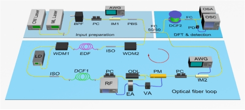 在该研究中,王兵教授课题组利用动态调制的光纤环在实验上实时观测到了频率布洛赫振荡现象。通过将相位调制接入光纤环路,对环路内脉冲频率进行调制,使等间隔频率模式之间相互耦合,以此构造频率光子晶格。光纤环路内每一圈的光程与调制信号周期之间存在时间失谐量,调制信号的相位在入射脉冲每次经过调制器时均会发生改变,此时,失谐量便起到了等效电场力的作用,使光子频率随循环圈数发生周期性变化,该现象即为频率布洛赫振荡。利用色散傅里叶变换(dispersive Fourier transformation, DFT)技术则可对输入脉冲的频率进行实时测量。