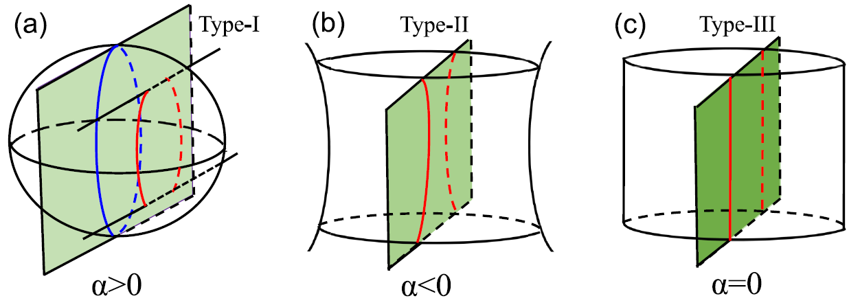 图2:开放型Weyl声子节线态的三种不同类型。(a)具有闭合趋势的开放型节线态,(b)具有张开趋势的开放型节线态;(c)完全平行的直线型Weyl声子节线态。三种类型可有特征参量α的正负或等于零进行区别(α参量的含义,可详见论文)。