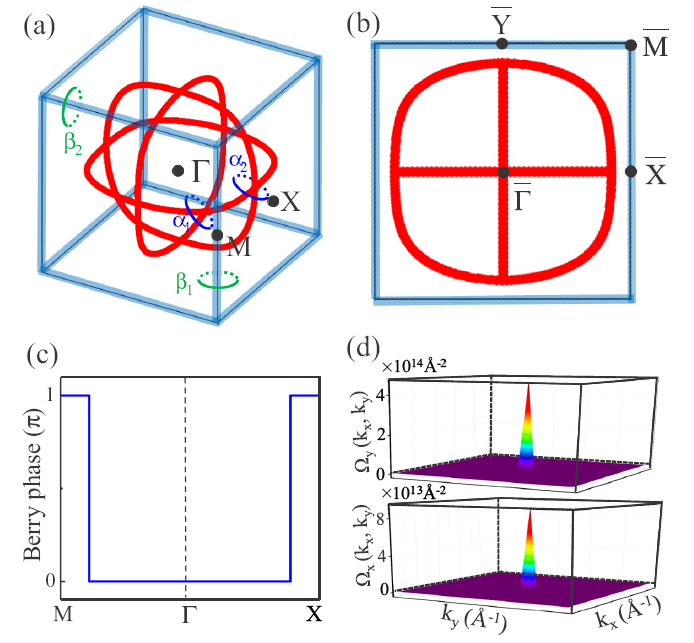 图1:高压相下CuCl半导体声子谱中存在的两种不同类型的拓扑声子节线态。(a)第一布里渊区内两种类型节线态的空间分布;(b)两种不同声子节线态在(001)表面的投影;(c)贝里相位在一高对称路径的变化;(d)贝里曲率分量在动量空间的分布。
