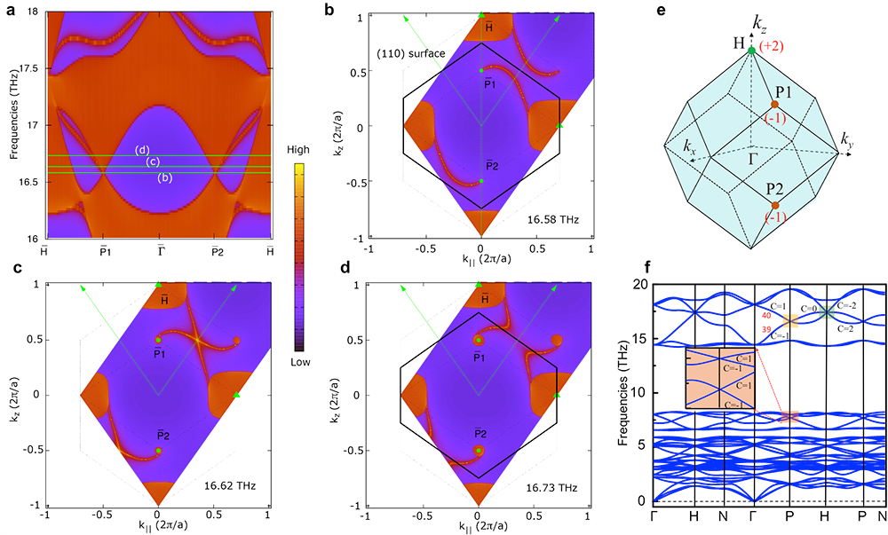通过对称性操作和不可约表示的进一步分析之后,该课题组发现在表2中的某些k点(由*标注),只存在表中所列的二度简并表示。即这些k点的外尔点的存在是由对称性保证的(对称性保证的外尔点),与电子系统的时间反演对称保证的Kramers外尔点形成完美对应。不同的是,后者在电子系统中通常需要比较大的自旋轨道耦合才能很好地显露出来,而这里提出的外尔点完全受晶体对称性保护,在玻色系统中可以很容易“暴露”出来,从而导致非常大和清晰的表面弧。随后研究者计算了对应材料的声子谱,验证了理论分析的结论。例如,在空间群号为199的K2Sn2O3材料的声子谱中,很容易地在P点发现Weyl点(见图3)。值得一提的是,在具体考虑第39和第40两个声子谱之间的拓扑简并点时,由于两个P的外尔点具有相同的Chern数(C=-1),这就需要有其他的拓扑简并点的存在,于是在H点发现了一个三重的自旋1的简并点(C=±2,0),在其(110)表面声子谱中,表面弧被清晰地显示出来(图3)。该项工作发表在npj Computational Material6:95 (2020)上(该期刊当年影响因子12.241)。