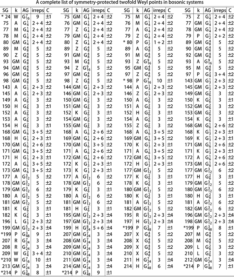 表2:玻色体系中对称性保护的外尔点。第一列和第二列分别标记空间群号(SG)和高对称的k点,第三列和第四列标记k点的小群对应的抽象群(AG)以及对应的不可约表示(irreps),最后一列给出了对应的拓扑Chern数。星号标记对称性保证的外尔点。