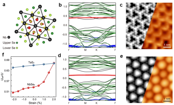 图2:a.温度升高至50K时SD发生的结构扭曲示意图;b,c.计算的4.4K的电子结构(b)和相应的STM模拟形貌与实验对比(c);d,e.计算的77K的电子结构(d)和相应的STM模拟形貌与实验对比(e);f.1T-TaS2和1T-NbSe2的有效库伦作用在应力下的变化。