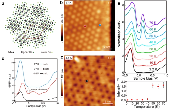 图1:a.SD结构示意图;b,c.77 K和4.4K下1T-NbSe2单层薄膜的STM形貌图;d.于b,c图中相应标识位置处所取的隧道谱;e.随温度变化的隧道谱;f.从e图中提取的160 mV峰的强度随温度的变化。