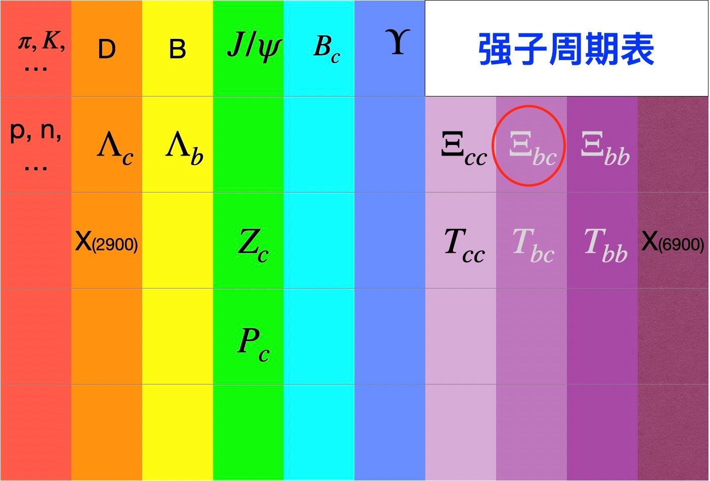 图1:强子周期表。不同周期强子包含夸克和反夸克数不同,不同主族强子包含夸克味道不同。