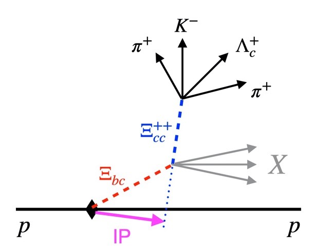 在过去的几年中,LHC已经多次尝试寻找Ξbc,但一直未有所获。秦溱课题组与合作者发现通过遍举衰变来寻找新粒子的传统方案对于Ξbc存在着很大困难。因为Ξbc包含一个b夸克,它衰变到任何一个特定遍举末态的概率都极低,这造成遍举方案的重建效率极低。为了克服此困难,课题组与合作者创新性地提出利用单举衰变来寻找Ξbc。该单举方案涉及的具体衰变过程是Ξbc衰变到Ξcc以及其他所有可能的粒子Ξbc→ Ξcc+X,如图2所示,此过程最有利的特征是Ξbc产生后在探测器中将飞行一段距离再进行衰变,这样就形成一个偏离主对撞顶点的Ξcc,而Ξbc是此现象的唯一主要来源。因此,搜寻到偏离主对撞顶点的Ξcc,便发现了Ξbc重子。这与天文观测中通过天王星摄动发现海王星有异曲同工之妙。