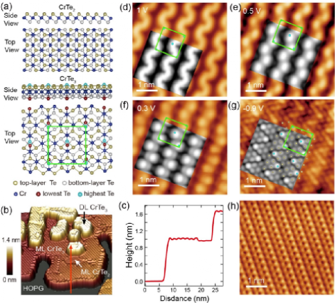 图1.CrTe3和CrTe2结构和形貌图。(a)CrTe2和CrTe3原子结构示意图。(b,c)薄膜的三维立体图(b)和台阶高度示意(c)。(d-g)CrTe3STM形貌图和对应的DFT计算模拟图。(h)CrTe2的STM原子分辨。