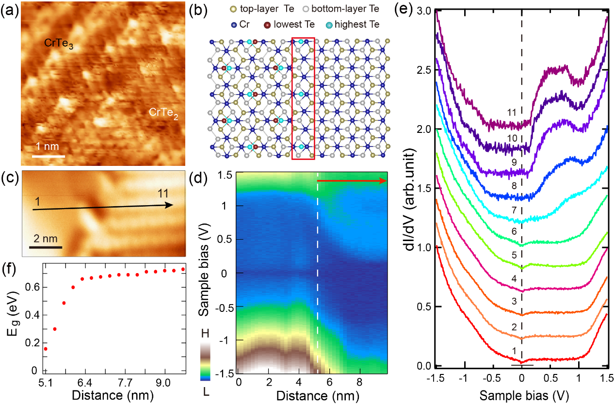 团队通过分子束外延(MBE)生长的手段,经过长期的探索,精确控制衬底温度和束流比,在高定向热解石墨(HOPG)衬底上成功生长出大面积单层和双层的CrTe3薄膜。其扫描隧道原子分辨像显示出特有的条纹状周期,随偏压呈现丰富的变化图样(图1)。这些偏压依赖的原子分辨像与第一性原理计算模拟结果良好吻合。通过对CrTe3薄膜的扫描隧道谱(STS)测量可以看到其电子结构上单层能隙0.93eV,双层能隙0.82eV。并且能隙随电子掺杂和温度升高变小,这一现象满足莫特绝缘体的特征。团队通过真空退火,CrTe3中的Te部分脱附形成CrTe2和CrTe3两相共存。两相交界处形成原子级平整的横向异质结。通过测量穿越晶界的扫描隧道谱,可以看到界面处明显的能带弯曲和能隙减小且平滑过渡(图2)。这些特征显示CrTe2-CrTe3界面具备了优秀横向异质结的特征。团队发现增加退火时间会使CrTe3完全转变为CrTe2相。可以设想,通过局域图形化热处理,有望可控构建规模化CrTe2-CrTe3-CrTe2横向隧道结器件。