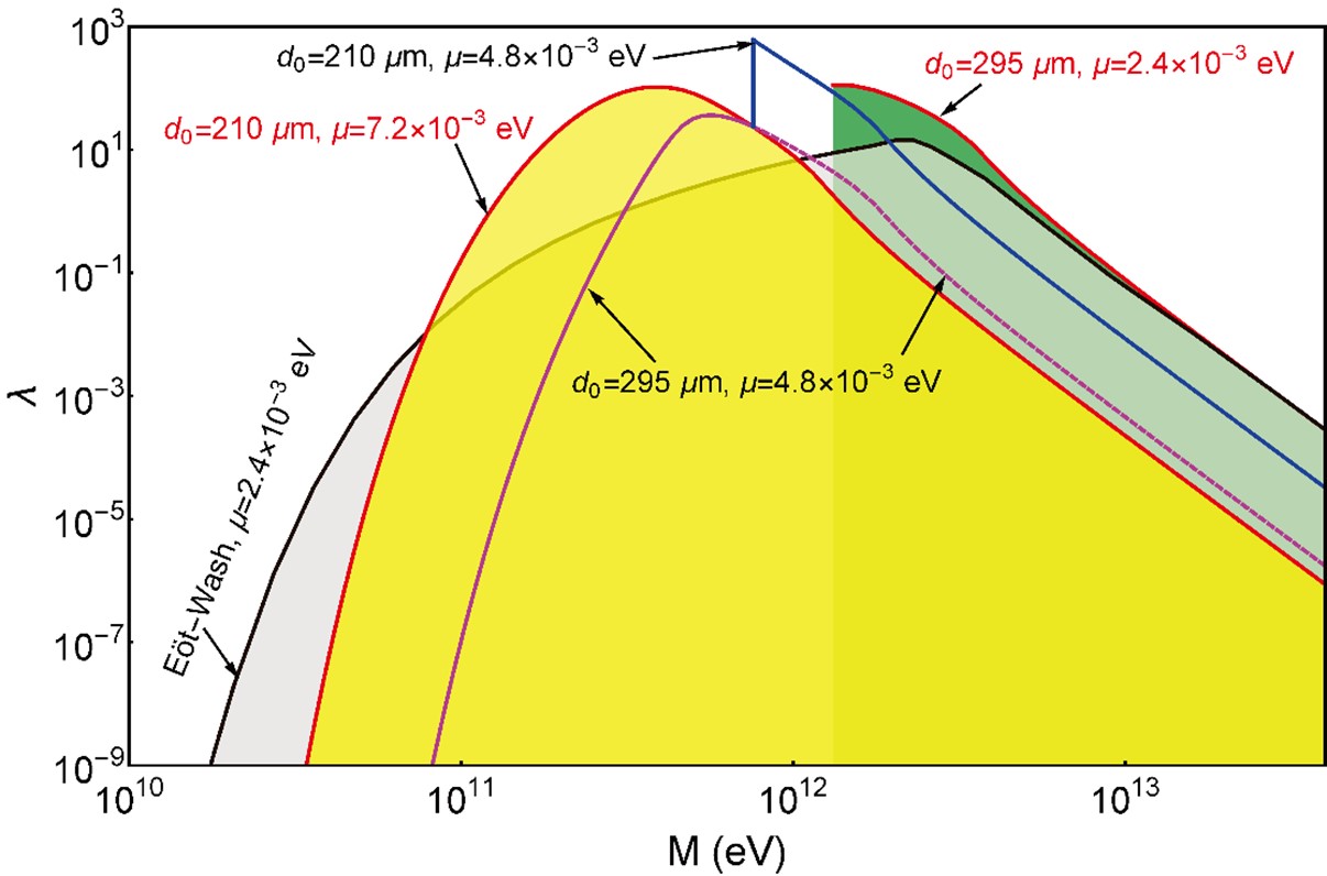 近年来,随着高精密实验技术的发展,实验室实验探测暗能量模型逐渐成为可能。引力中心团队长期致力于研究精密扭秤技术,并基于此开展了不同间距下的牛顿反平方定律高精度检验实验,取得系列国际领先成果。团队发现亚毫米间距下的反平方定律检验实验(HUST-2020)能为对称子模型参数提供强有力限制。结合图1所示的实验配置,团队计算了扭秤和吸引质量间可能的对称子场分布、分析了静电屏蔽膜效应,最终给出了如图2所示的模型参数限制区间。结果显示HUST-2020实验对meV质量尺度的对称子场极其敏感,对暗能量尺度μ=2.4×10−3eV对称子场的限制在M=1.3TeV处比当前国际最好限制水平提高了约10倍,排除了更宽范围的模型参数空间。该工作有助于推动人类对宇宙演化及其加速膨胀根源的研究。