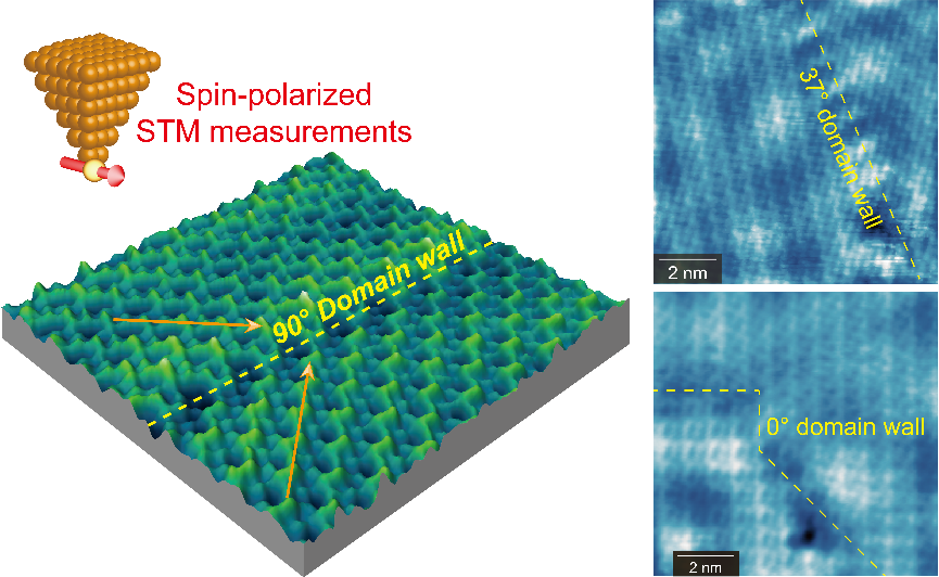 以此为基础,团队还深入开展了Fe4Se5超薄膜的磁畴结构研究。如图2对比所示,理论上Fe4Se5晶格有可能形成三种畴界:37°、0°和90°。但由于晶体的四重对称性,常规STM(非磁W针)仅能观测到37°的畴界。得益于反铁磁基态的对称性破缺,SP-STM(磁性Fe针)则观察到畴界两侧的反铁磁条纹可能会发生半个晶格位错或90°旋转,从而分辨出0°和90°的畴界。此外,通过对不不同温度下磁性条纹的演化自旋极化发现:直到45 K的时候,反铁磁磁有序还是能稳定的存在。然而,部分的反铁磁磁畴已经开始消失,这表明面内的长程磁有序结构会逐渐转变为短程磁结构。