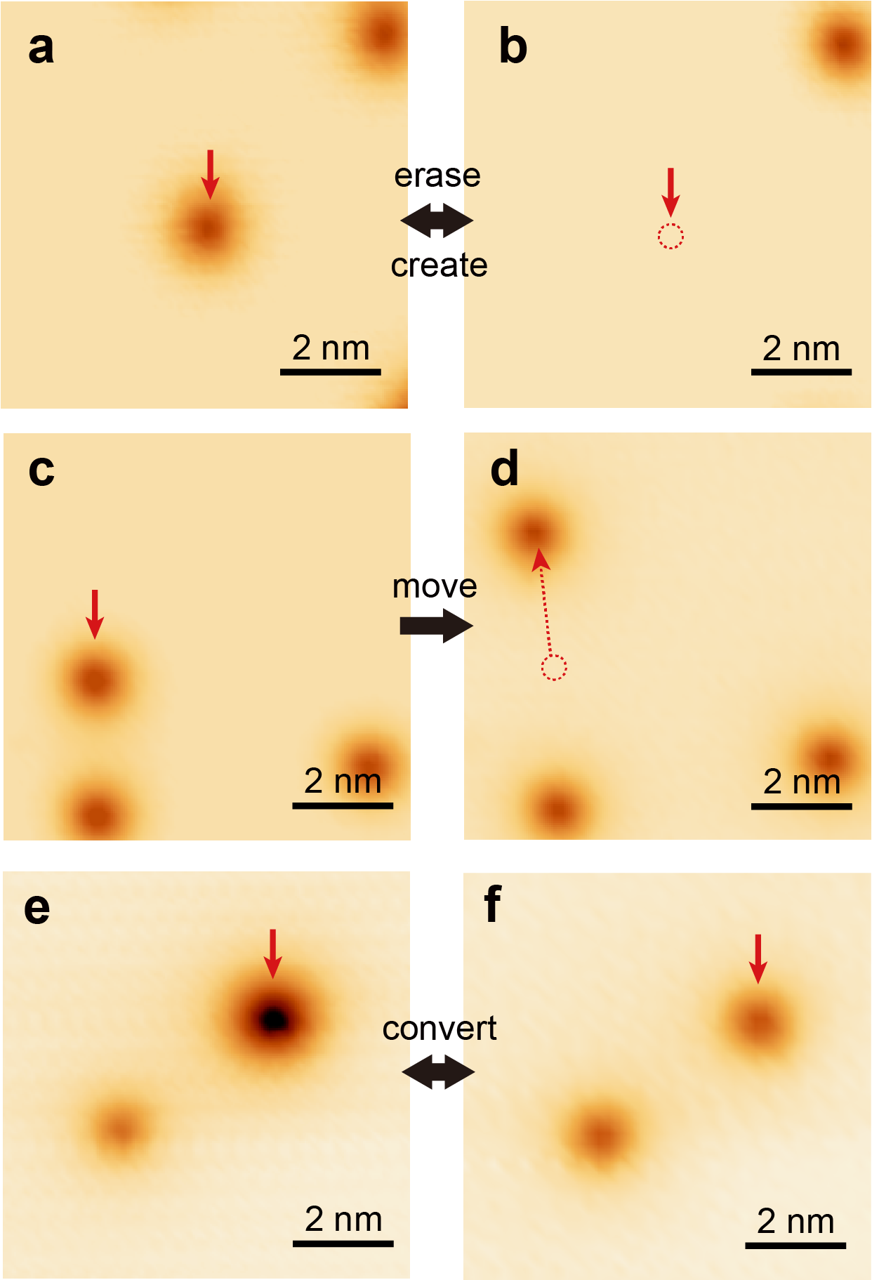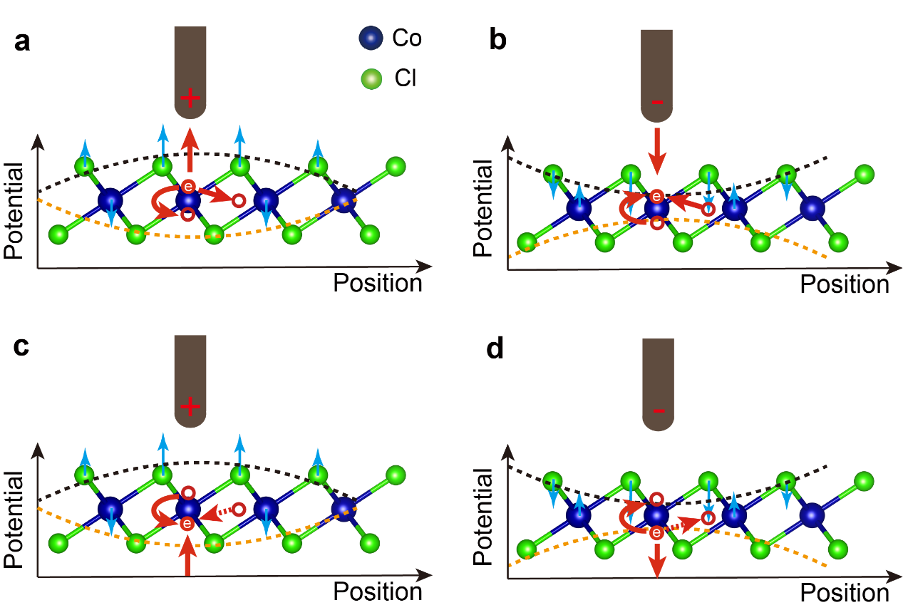 极化子作为单个电子和晶格畸变相互作用而形成的准粒子,在电荷输运、巨磁电阻、高温超导以及热电和多铁效应等物理过程中具有重要作用。目前其研究主要通过量子电输运、角分辨光电子能谱以及电子共振谱等宏观测量手段。在微观尺度上通过具有原子级分辨扫描隧道显微谱学研究单个极化子的性质对于理解电-声物理作用机制具有重要作用,但是很难实现。这是由于极化子通常出现在极性较大的绝缘性离子晶体中,但是其大的能隙使得离子晶体不导电,从而无法用扫描隧道谱手段研究。基于此,研究人员创新性使用分子束外延方法在高定向热解石墨(HOPG)衬底上长出了具有较大极性的过渡金属二卤化物CoCl2单层薄膜。HOPG衬底与单层薄膜相互作用很弱,既不影响单层膜的本征性质又允许电子隧穿从而可以用扫描隧道谱表征。研究团队在单层CoCl2中发现了多种极化子,具有不同的微观形貌,晶格占位以及极化子态特征。他们通过施加不同极性和大小的偏压,实现了不同种类极化子有效和可控的操纵,包括单个极化子的产生、移动、擦除以及不同类型的相互转化(图1,图2)。第一性原理计算给出了不同种极化子的稳定结构和与实验一致的微观形貌。最后,根据大量的实验统计,他们发现这些操纵的驱动机制是扫描隧道显微镜针尖电场效应和电子的非弹性隧穿效应的共同作用(图3)。他们还将这种单极化子的操纵推广到其他过渡金属二卤化物体系FeCl2中,证明极化子在该类材料中普遍存在,这对在微观尺度下研究单极化子提供了思路。