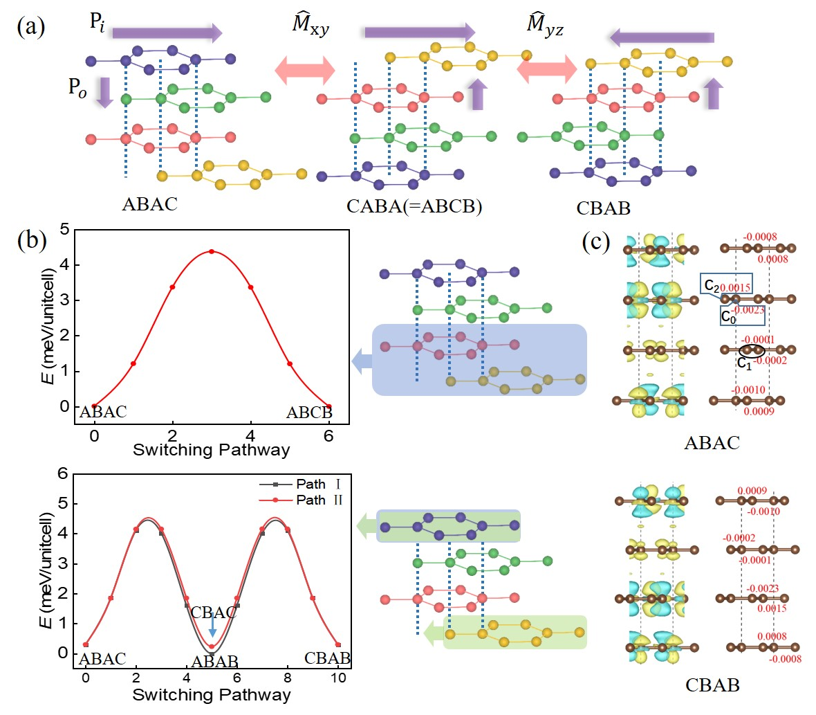 图1 4层石墨烯中的铁电性。(a) 极化态ABAC、CABA和CBAB之间的切换,其中极化方向用紫色箭头表示;(b) 由NEB方法计算得到的势垒和对应的滑移方式;(c) 极化态的差分电荷密度分布和Hirshfeld电荷分析。