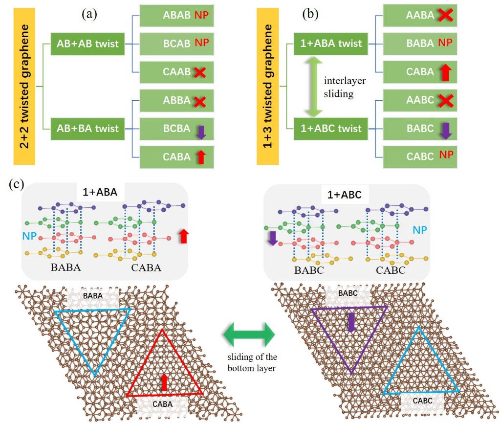 图2 4层转角石墨烯体系中的“摩尔滑移铁电”。(a)2 + 2转角和(b)1 + 3转角形成的不同的堆叠畴,箭头表示极化方向,NP表示非极性畴,X表示包含AA堆叠(能量很高,结构重构后畴将收缩变小);(c)1 + 3转角四层石墨烯的双极化态和铁电翻转路径。