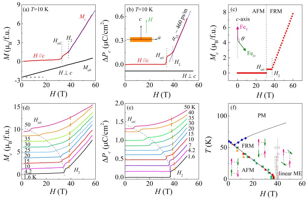 图:(a)磁化强度与磁场的关系曲线;(b)电极化强度与磁场的关系曲线;(c)基于简化自旋模型的M-H模拟变化关系;(d)不同温度下的磁化强度与磁场的关系曲线;(e)不同温度下的电极化强度与磁场的关系曲线;(f)根据实验和理论计算结果构建的Fe2Mo3O8磁电相图。