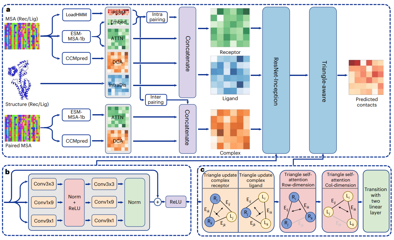 蛋白质通过与其他生物分子相互作用或者自组装形成复合物来发挥特定的功能。揭示蛋白质-蛋白质间的相互作用接触信息不仅能够帮助理解生命活动的分子机制,而且对于构建蛋白质复合物三维结构,进而研究其生物学功能有着重要的作用。随着人工智能方法的不断发展,蛋白质单体结构预测已经取得巨大的突破,尤其是AlphaFold2的问世,更是将单体结构预测的精度提升到实验级别。但是,蛋白质复合物结构预测仍然存在许多挑战,特别是异源复合物在预测精度仍有待提升。现有的蛋白质复合物链间接触预测方法存在着许多的不足。首先,大部分的方法只使用了卷积神经网络来提取局部特征,而蛋白质复合物中相互作用的氨基酸对在序列上存在许多长程相互作用,这需要更深的网络来提升感受野,其次,主流算法预测的蛋白质-蛋白质链间接触图中存在大量违背几何约束的接触对。