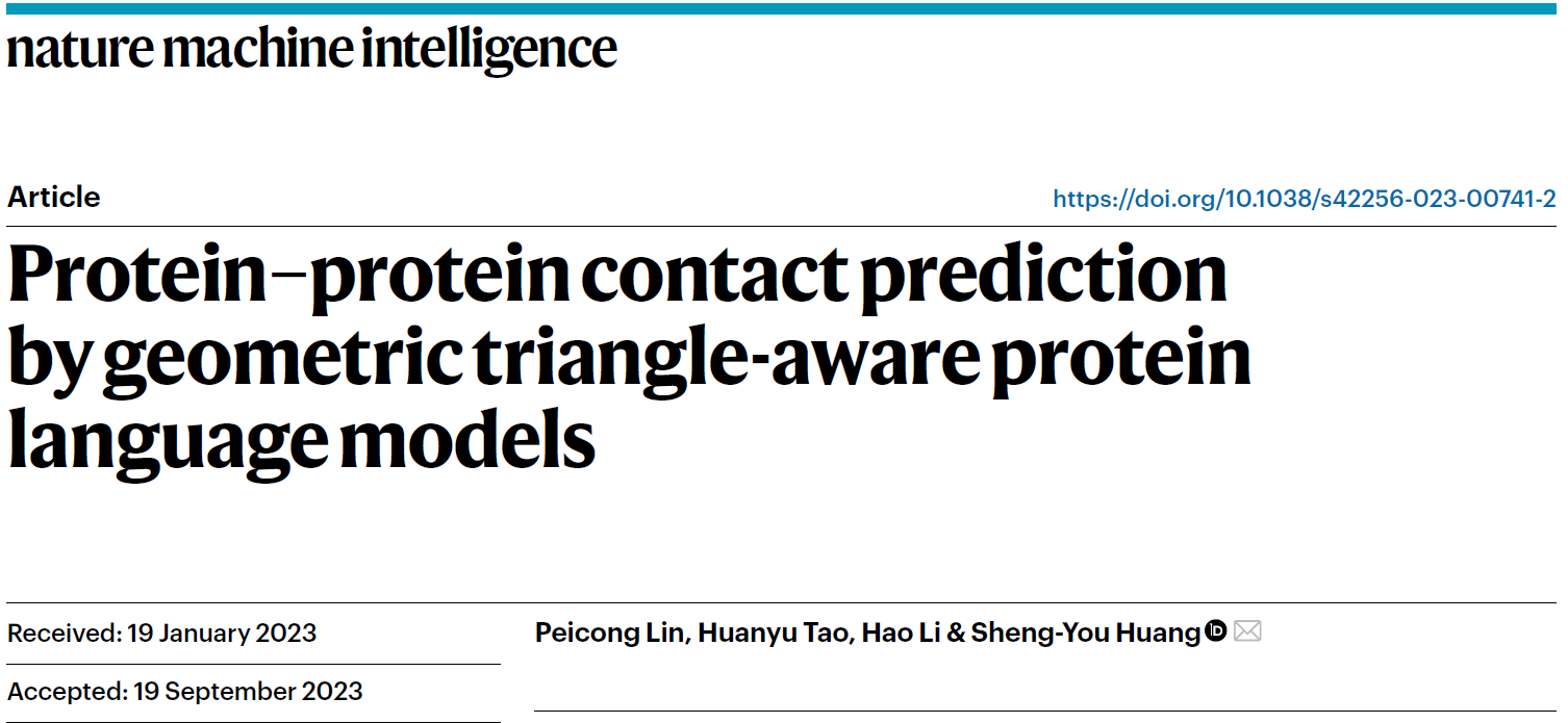 10月19日,我院生物物理团队黄胜友教授课题组在蛋白质-蛋白质相互作用预测领域取得重要进展,相关成果发表于《自然·机器智能》(Nature Machine Intelligence),题目为《基于几何三角感知和蛋白质语言模型的蛋白质-蛋白质接触预测》(Protein-protein contact prediction by geometric triangle-aware protein language models)。华中科技大学为唯一通讯单位,我院博士生林培聪为论文第一作者,博士生陶环宇和李豪为共同作者,黄胜友教授为通讯作者。