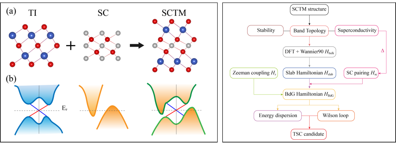 左图:利用在拓扑绝缘体中插层超导单元的方法来设计拓扑超导金属的新范式;右图:基于第一性原理计算表征拓扑超导不变量的计算流程图