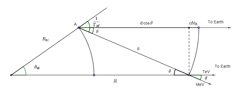 图二解释TeV凹陷的双区模型示意图。来自余辉的TeV光子图中沿下方的水平线传播,主暴的MeV光子主要从角度最大的A点发射,其中到达地球的沿图中水平方向传播,而与TeV光子湮灭的向斜下方传播,这导致了相互湮灭的TeV和MeV光子并不同时到达地球,也就是MeV辐射峰值与TeV辐射凹陷的不重合。