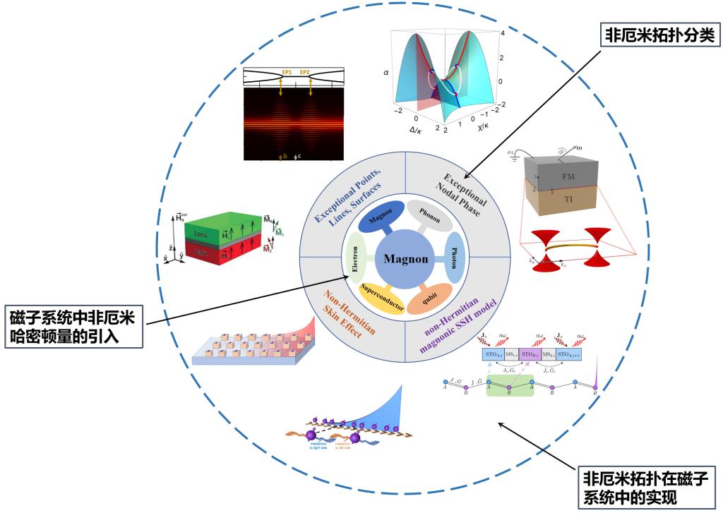 非厄米拓扑磁子学是“非厄米物理”、“拓扑物理”和“磁子学”三个领域交叉融合形成的“磁学与自旋电子学”的一个研究分支,它以独特的视角为解决磁子集成电路所面临的重要瓶颈提供了一些原理方案。图1绘出了非厄米拓扑磁子学的内涵: