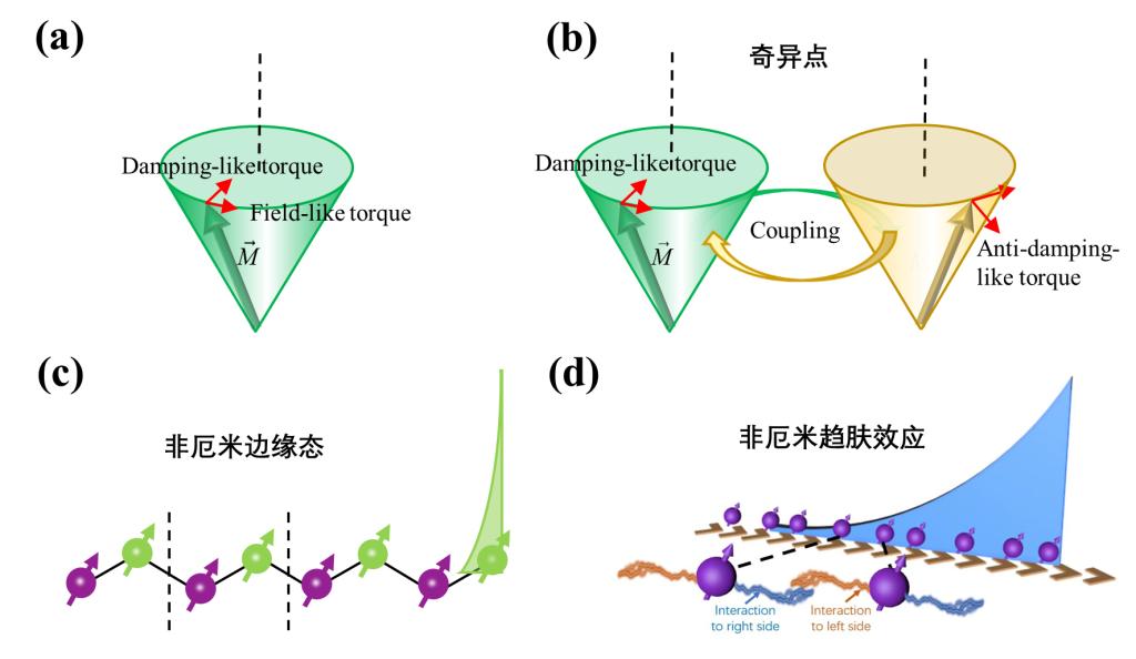 图2展示了非厄米拓扑磁子学的理论框架。其中最内层展示了非厄米哈密顿量如何在磁子系统中涌现。一方面,磁子自身可与各种准粒子如磁子、声子、电子、光子乃至量子比特相互作用,从而贡献了磁子的“自能”。这一自能通常为复数,其虚部相当于磁子耗散的速率。图3(a)所示,磁矩绕外场进动时会受到阻尼力矩(damping-like torque)的影响从而逐渐偏向于饱和磁矩方向。这里的阻尼力矩减少了磁性系统的能量,也就是耗散。相对地,也可以通过外界调控对磁矩施加一个反阻尼力矩(anti-damping-like torque),也就是增益,如图3(b)所示。另一方面,不同磁子可与同一个“热库”相互作用从而通过热库中的准粒子作为媒介实现磁子之间的(手性)耦合。这两种方式都可以在磁子哈密顿量中引入非厄米项,相应的理论方法和重要近似(如非马科夫过程和量子跳跃)可参考综述中第二章所述的量子主方程方法和格林函数方法。