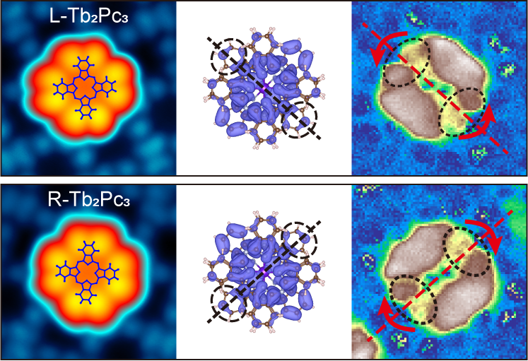 结合第一性原理计算,团队发现电子对最低未占据分子轨道(LUMO)态的占据引起了Jahn-Teller畸变,导致最顶层Pc配体内碳原子坐标出现了类似螺旋桨的畸变,左右手性Tb2Pc3的螺旋相反。结构畸变解除了原来二重简并的LUMO,产生配体自旋,也就是实验中近藤效应的起源。计算得到的分子轨道电荷分布与实验的近藤峰空间分布相吻合(图1),说明实验观察到的近藤峰自旋手性分布起源于顶部Pc配体旋转引起的Jahn-Teller畸变。