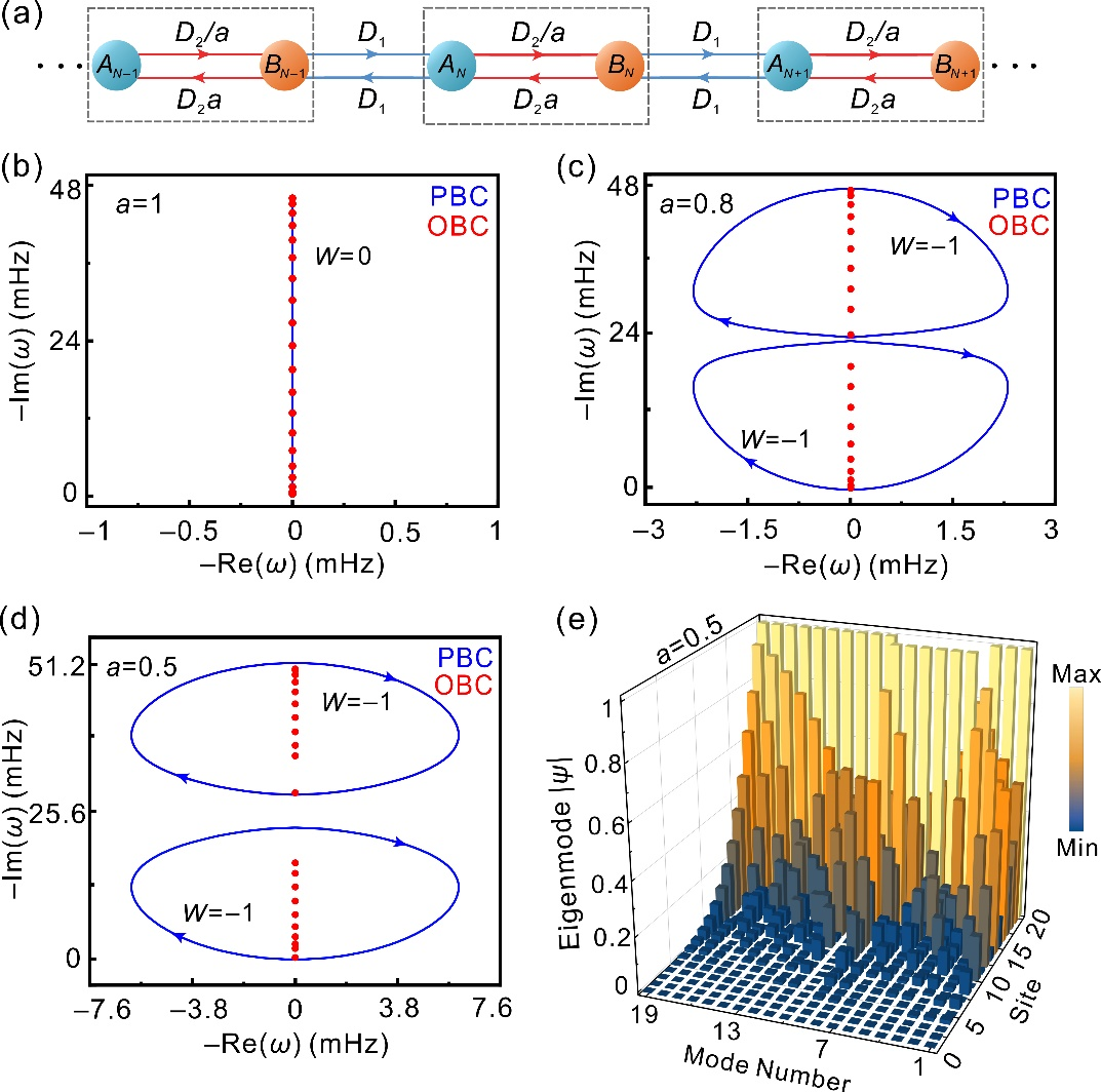下一步,研究团队将具有不对称温度场耦合的腔体二聚体阵列形成SSH模型(图2a)。在该系统中,当非对称因子时,开边界条件下的特征值被周期性边界下的特征值环所包围,这表明了体边界对应被打破,揭示了扩散系统的非bloch体-边界对应。为了描述复平面能谱的环路特性,研究团队计算了卷绕数,意味着本征态在右侧边界呈现趋肤模式。此外,开边界条件下本征模的本征场分布(图2e)也印证了这一点。