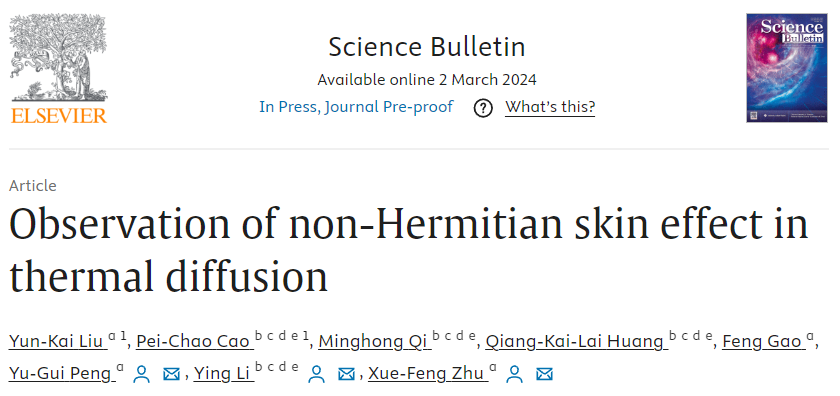 近日,我院祝雪丰教授课题组与浙江大学的李鹰研究员课题组合作,在热扩散体系非厄米趋肤效应方面取得重要进展,相关工作以“Observation of non-Hermitian skin effect in thermal diffusion”为题,于2024年3月2日在线发表在《Science Bulletin》上。物理学院博士生刘云开和浙江大学博士后曹培超为论文的第一作者,祝雪丰教授、彭玉桂副教授以及浙江大学李鹰研究员为论文的共同通讯作者。物理学院博士生高峰,浙江大学博士生祁铭鸿、黄强开来对该工作也有重要贡献。华中科技大学为该工作的第一完成单位。