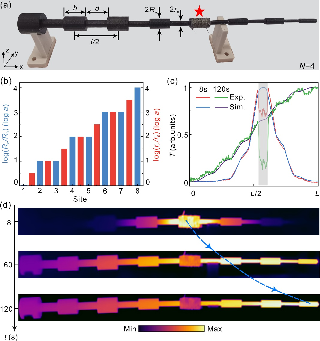 为了实验验证该理论设计,研究团队通过金属加工制备了图3所示的实验样品。为了减小空气对流对结构传热的影响,在真空腔中进行实验,并通过外加电路的方式对结构施加初始温度。通过对不同时刻结构上温度场的测量,可以发现,在施加初始温度之后,最高温度场区域不断的在向结构的右侧移动,并在120s左右到达结构的右侧边界,与模拟结果有极好的一致性。