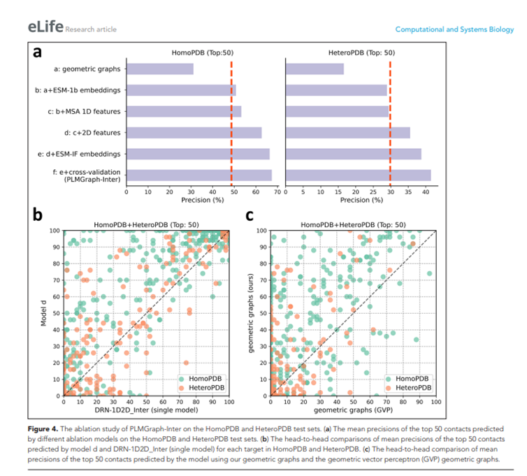 该研究发展了一套基于蛋白质语言模型嵌入几何图的蛋白质互作残基接触预测模型,其性能大幅优于此前的模型,该结果体现了蛋白质语言模型表征与蛋白质几何图结合的有效性。该模型将为团队进一步整合蛋白质的物理和进化信息来发展准确的蛋白质互作预测和建模方法提供基础。