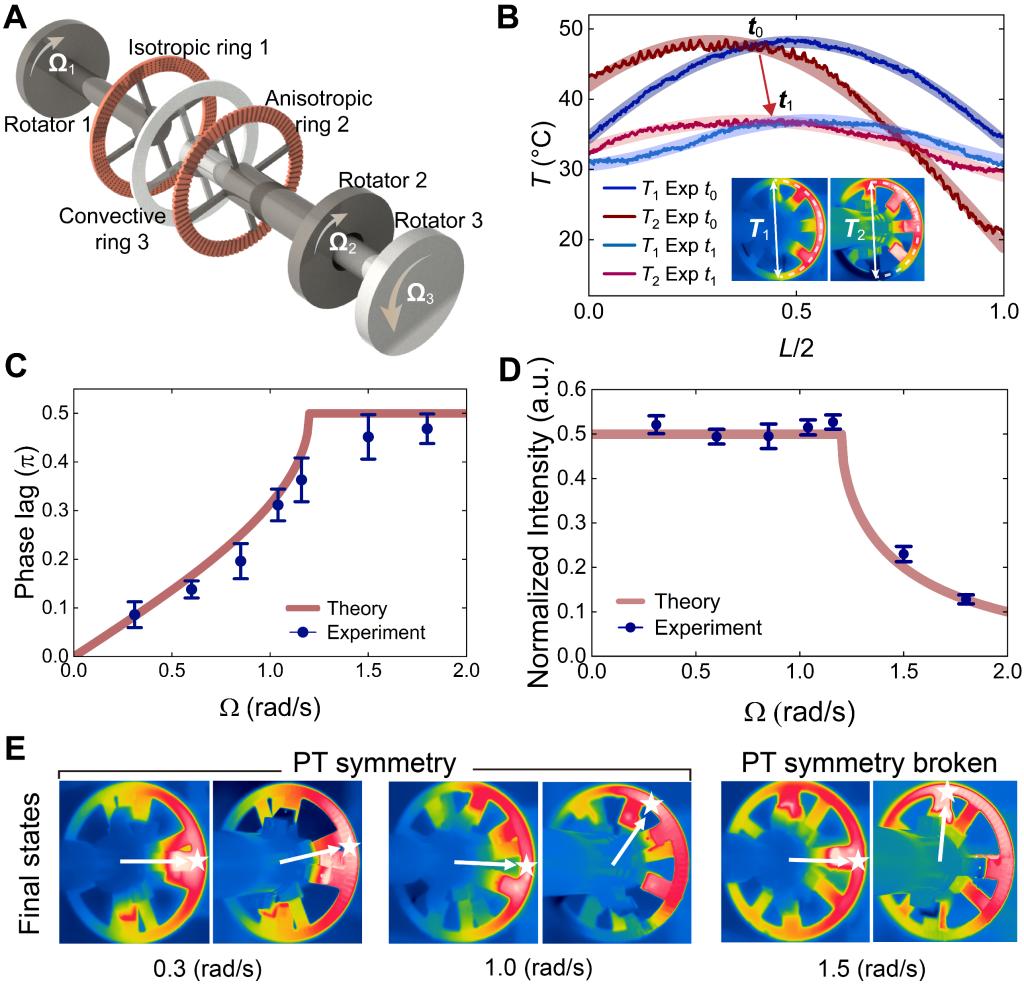 在实验中(图2),研究人员采用环结构引入空间周期分布的热场,通过机械驱动的方式引入对流,并利用材料各向异性设计为耦合环带来扩散率失谐。为抵消中间辅助环强对流带来的温度场整体相位偏移,可在两侧耦合环添加较小的反向对流。实验观测到PT对称相变前后的两环温度场相位差和振幅比所表征模式简并与劈裂,并发现无论在对称相还是对称破缺相温度场最高温位置均可保持不动,表明相位振荡得到较好抑制。