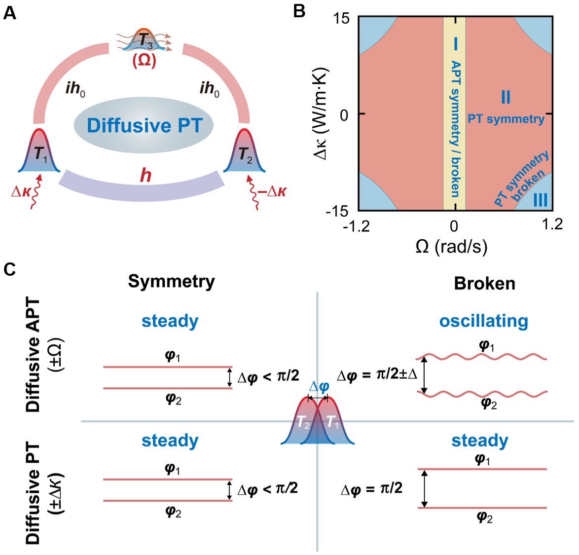 图1.热扩散PT对称。(A)热扩散PT对称的构建;(B)热扩散PT对称相图;(C)热扩散PT对称相位振荡抑制。