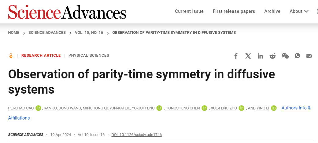4月19日,祝雪丰教授和浙江大学李鹰教授联合团队在扩散系统中首次实现宇称-时间对称,相关成果以“Observation of parity-time symmetry in diffusive systems”为题发表于Science Advances杂志。该工作发表于Science Advances,曹培超(物理学院2022届博士,现为浙江大学博士后)为第一作者,李鹰教授、祝雪丰教授、陈红胜教授和彭玉桂副教授为共同通讯作者。