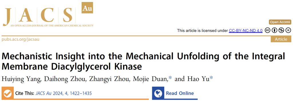 近日,《JACS Au》发表了我院生物物理团队余昊课题组和中科院精密测量院段谟杰课题组在单分子力谱研究膜蛋白折叠稳定性方面的重要研究成果(JACS Au, 2024, 4: 1422),论文标题为“Mechanistic Insight into the Mechanical Unfolding of the Integral Membrane Diacylglycerol Kinase”。我院博士生杨会莹为论文第一作者,博士生周代红和周章怡也参与了相关工作,余昊教授和段谟杰副研究员为共同通讯作者。
