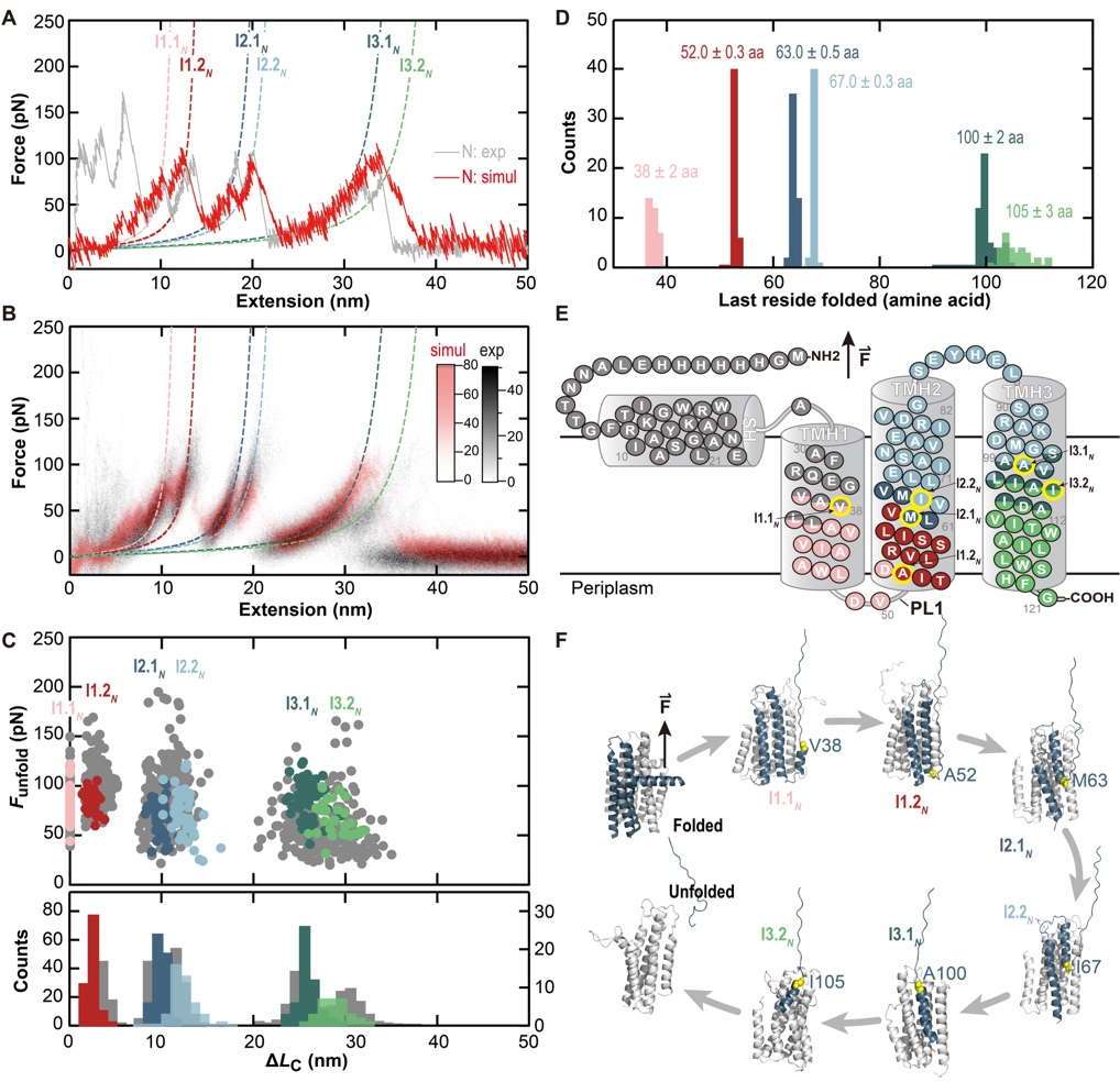 图1单分子实验和分子动力学模拟实现对膜蛋白去折叠路径的精确结构分配。
