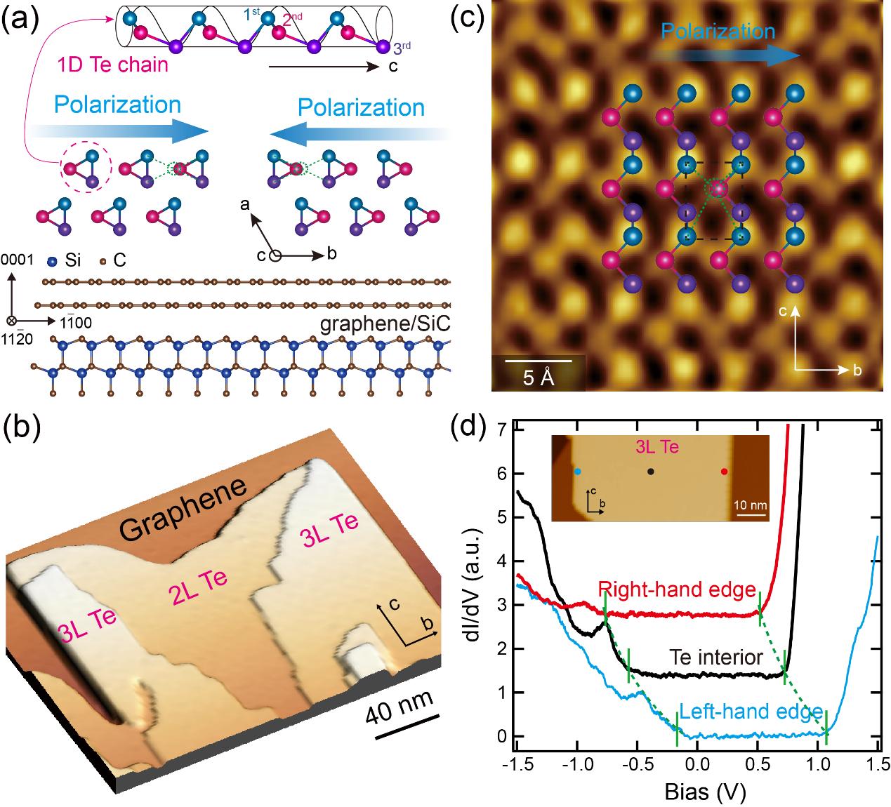 本研究中,付英双团队利用低温扫描隧道显微镜/谱学(STM/STS)测量方法,在纳米尺度上系统地研究了单质Te多层膜中的自发电极化。首先,研究团队采用分子束外延(MBE)技术,精确控制生长条件,成功制备了原子级薄的Te薄膜。通过原子分辨的STM成像,观测到了第二层Te原子的位置分布,发现它偏离了中心位置,证实了α-Te结构的中心对称性破缺。考虑到薄膜中由于电荷累积而产生平面内的电荷极化现象,这种极化在空间分辨的二维电导线谱和电导成像中,表现为岛边的能带弯曲行为,并且在相反的极化边界上存在反向的能带弯曲趋势,能带弯曲方向取决于电荷的极性。进一步确定了自发电极化的方向,是沿着垂直Te螺旋链的b轴方向,且是位于面内的。