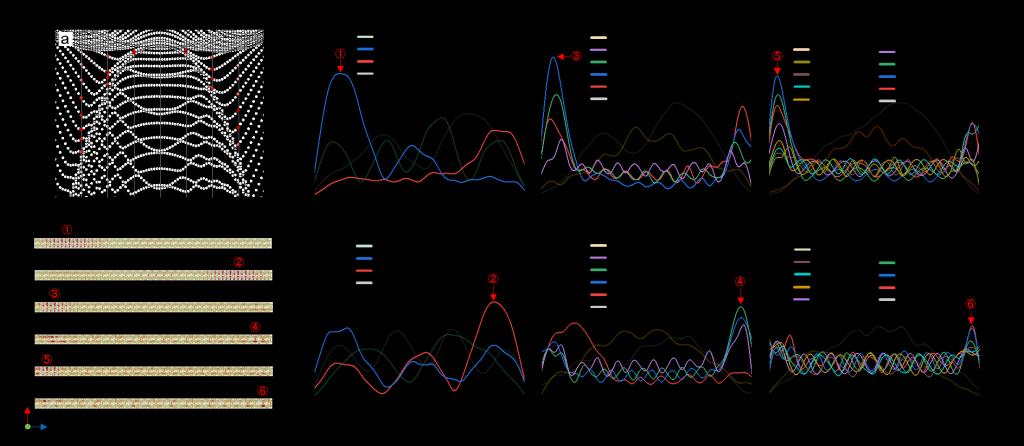 为了证实其的理论分析结果,该课题组通过构造满足198号空间群的紧束缚模型,成功地在没有四重旋转对称性的结构中,实现了陈数为4的单极性外尔点。因为旋转对称性和陈数的不匹配,导致这种单极性外尔点所诱导的拓扑表面态呈现非均匀的风扇型。进一步地,通过构建与紧束缚模型相对应的实际声子晶体(见图2(a),并结合有限元仿真模拟,也成功地观测到非均匀性风扇型表面态的存在和空间分布,见图2(e)-(f);且发现该非均匀性风扇型表面态的不同叶片上,呈现不同的声波分布模式和分布强度,并且表面态模式随着远离单极性外尔点而逐渐减弱,见图3所示。