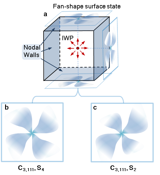 图1:陈数为4的单极性外尔点对应的两种不同类型的风扇型拓扑表面态。(a)一个单极型外尔点和封闭型外尔节线面在拓扑荷上形成补偿、并诱导风扇型表面态,其扇叶数与孤立外尔点的拓扑荷数紧密相关;(b)和(c)两种不同类型的风扇型表面态。