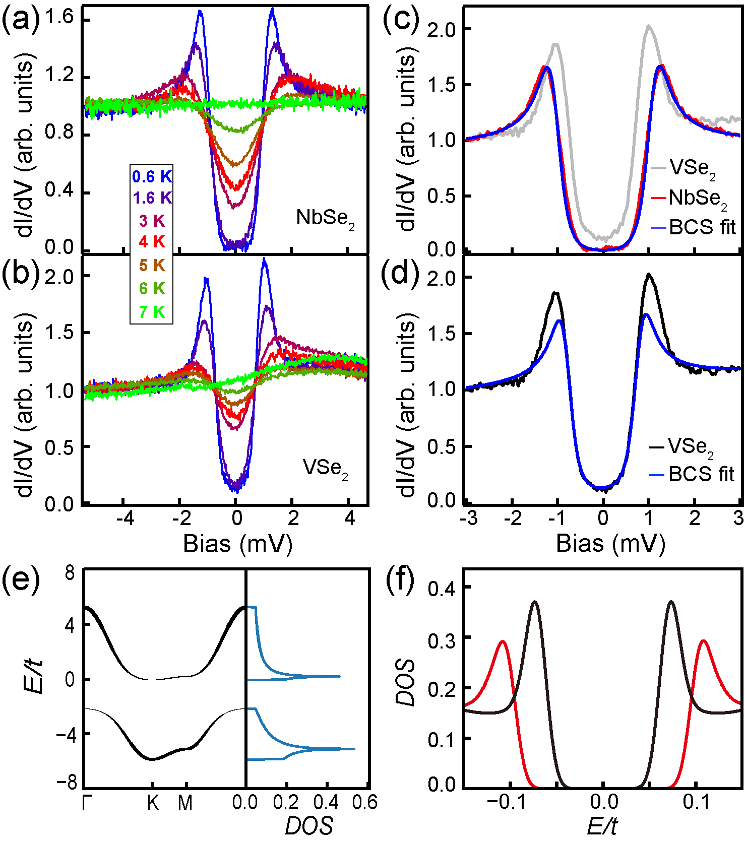 此外,在单层VSe2表面还测量到一个超导能隙,这来源于超导2H-NbSe2衬底的超导近邻效应。VSe2的近邻超导能隙呈现出与衬底相似的形状,能隙大小有所减小,但相干峰强度却略有增强,导致其形状不能用传统的BCS模型完美拟合。通过考虑重电子参与超导配对的有效近藤晶格模型,成功复现了实验中的近邻超导能隙特征,重电子带的杂化性质导致了相干峰的谱权重增加(图3)。