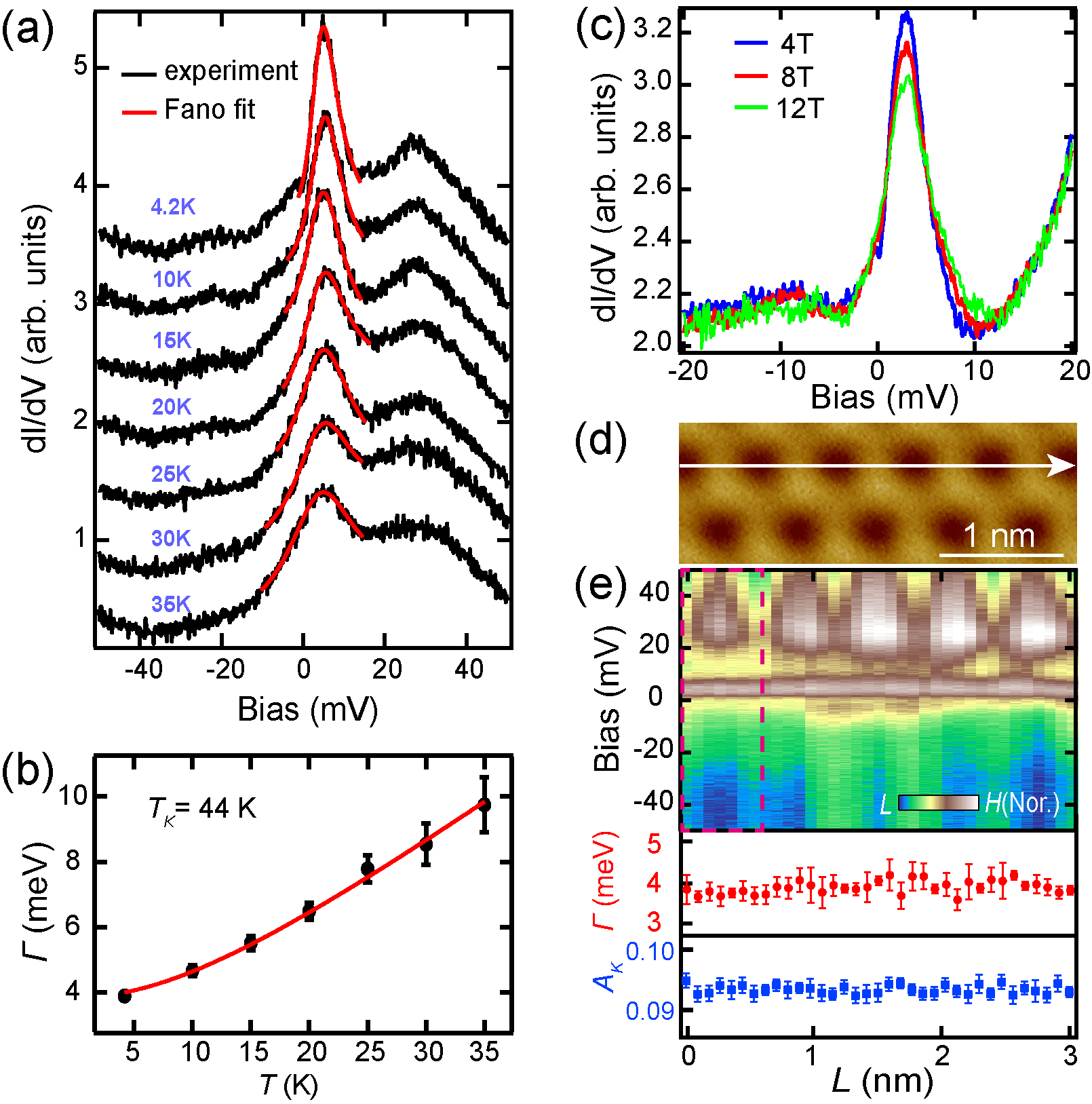 图2.近藤共振的温度与磁场依赖性,以及空间均匀性。