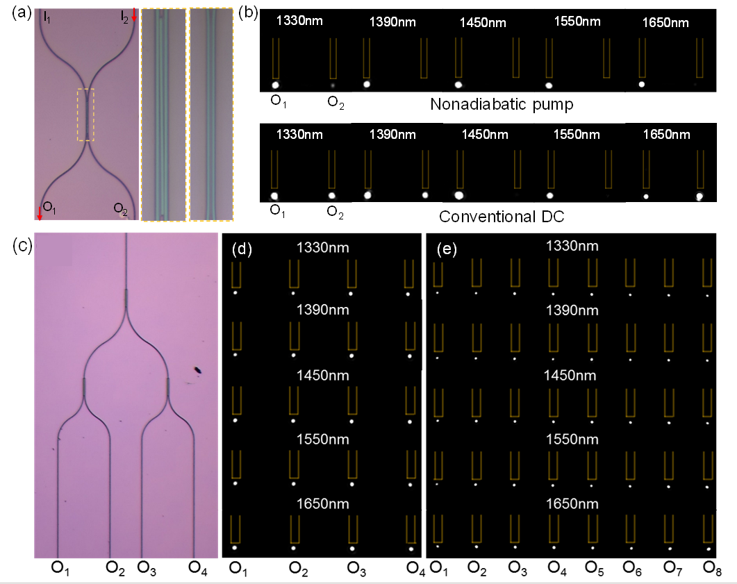 图.(a)定向耦合器显微图像;(b)非绝热拓扑泵浦定向耦合器与传统双波导定向耦合器的测试结果对比;(c)基于非绝热拓扑泵浦的宽带多级光分束器;(d)4级和(e)8级宽带片上集成光分束器的测试结果。