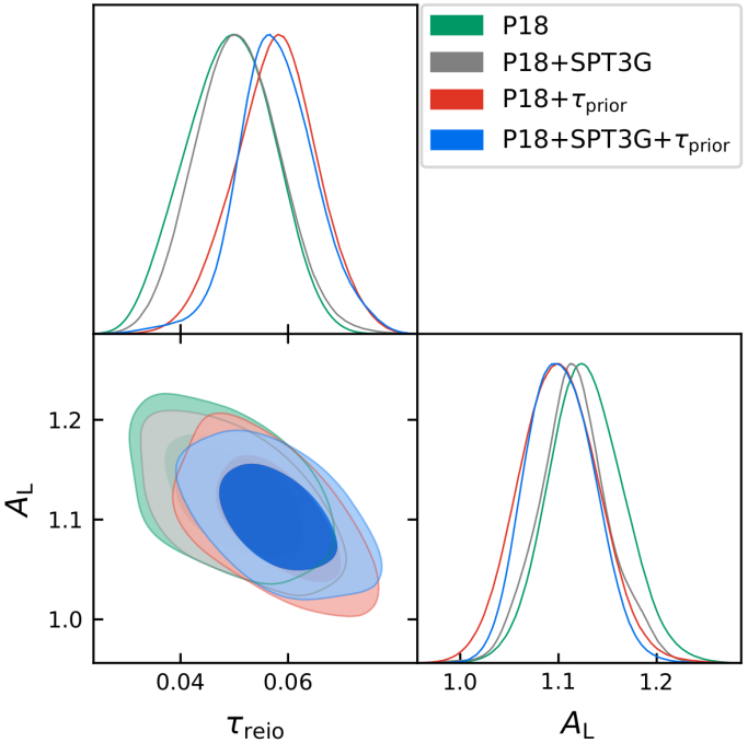 在这一思路下,邱涛涛副教授课题组构建了一个具体的反弹—暴胀模型并计算了原初扰动功率谱,利用Planck 2018以及SPT3G的数据,通过马尔科夫链—蒙特卡洛模拟得到了宇宙学参数的后验分布。 结果显示H0=69.49±0.045km/s/Mpc,将哈勃常数冲突减小到3σ的置信水平;S8=0.0776±0.017,与局域观测没有冲突。此外,透镜幅的最佳拟合值从AL=1.18减小到AL=1.10,更接近标准宇宙学模型预言值1。 课题组将这种修改原初宇宙解决宇宙学冲突的方案称为“原初方案”。最后,课题组的研究还发现CMB的透镜反常不一定真实存在,很有可能是和光深的简并效应造成的。