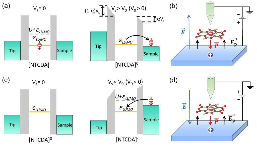 由于NTCDA分子与衬底间的相互作用相对较弱,使分子达到相对解耦的水平,因此这种电荷环电导强度及其方向变化的机制可以用双势垒隧穿结(DBTJ)进行解释。如图2a,b解释了基态为阴离子态的分子(1-型),在施加足够大的正偏压后,LUMO放电并进入隧穿窗口增强电子传输,并且分子驻留电子与镜像空穴产生的偶极感应电场与尖端电场相同,也增强了电子传输。如图2c,d解释了基态为中性的分子(2型),在施加足够大的负偏压后,LUMO充电并进入隧穿窗口增强电子传输,并且分子驻留电子与镜像空穴产生的偶极感应电场与尖端电场相反,此时两种因素相互竞争。同时,结合s波尖端沿的分子长镜轴的相消隧穿,从而引发了电荷环在不同方向的强烈变化。
