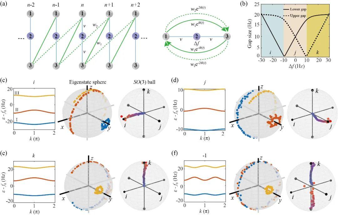 研究团队还将拓扑不变量的测量推广到了非阿贝尔范畴。对于满足PT对称性的多带拓扑系统,各能带整体的拓扑性质可由NA拓扑荷来表征。这些拓扑荷可以通过观察本征态在球面上旋转来确定即通过SO(3)流形上的绝热演化路径来判断拓扑荷。作为验证,我们构建了一个满足PT对称的三能带紧束缚模型,如图4所示。通过激发系统的本征态并驱动其沿着k绝热演化,我们直观地证明了其拓扑性质。该理论是传统实规范方法的重要补充,为非阿贝尔拓扑系统的研究提供了新的依据,并有望适用于其他非阿贝尔编织过程。