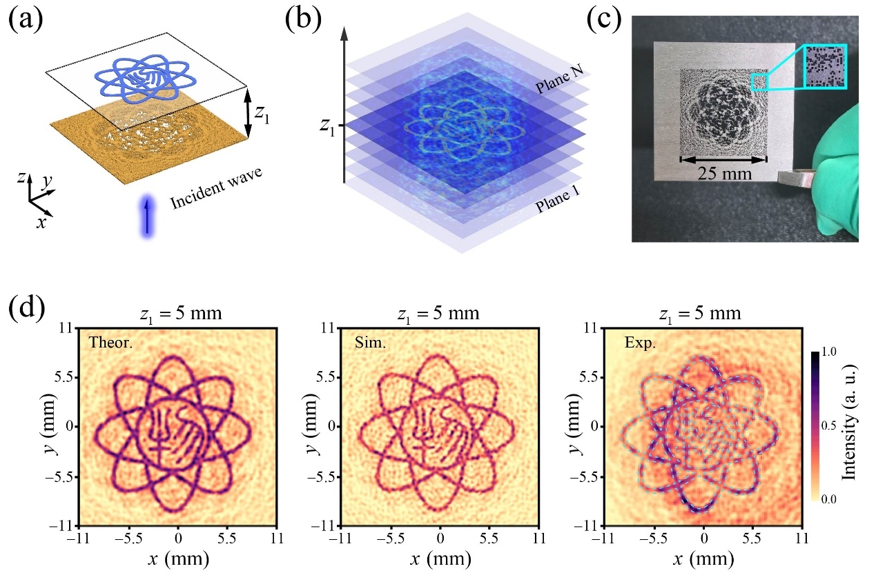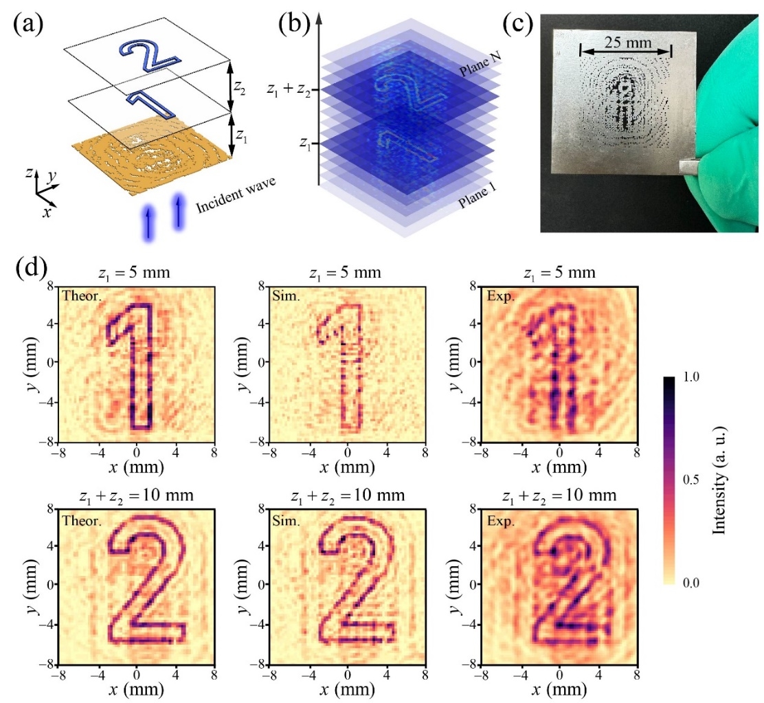 随着超材料与全息技术的快速发展,研究人员提出了更为复杂的波前调制方式,从而在目标成像面上实现了二维复杂波场的图案化重建,甚至发展出三维全息成像。在本研究中,研究团队提出了一种基于高像素二进制超表面实现高分辨多维声全息的通用方法,即采用前向优化策略和角谱法计算声波在目标成像面上的场分布。通过遗传算法,我们比较像平面与目标面上的声场分布,反复迭代直至收敛。本方法将源面上的振幅离散为一系列“0”与“1”元素,无需将相位分布映射为振幅分布,从而提升全息图的质量。如图1所示,将不同全息图案编码到不同深度的像平面上,可以实现同一频率多深度全息。团队所设计出的高像素全息超表面采用皮秒紫外激光加工技术(波长355 nm,脉宽< 8 ps)制备得到,加工精度高达10 μm。
