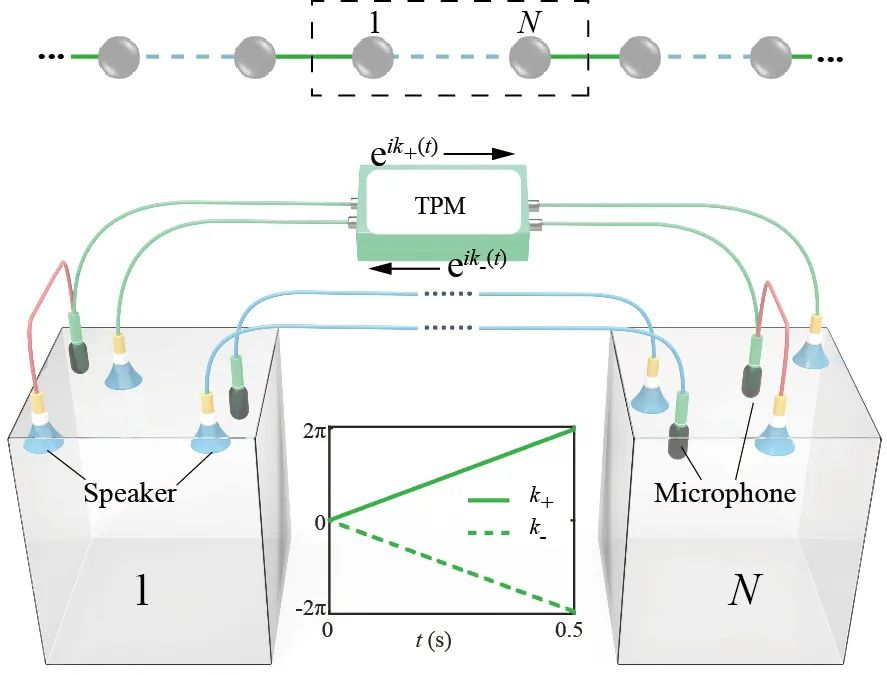 为了观测拓扑波函数的绝热演化,研究团队提出了一种构造合成布里渊区的普适方法。以一个一维紧束缚模型为例,如图3所示,其元胞包含N个原子,从哈密顿量中可以看出布里渊区k即等价于元胞最外侧1和N之间复共轭的耦合相位。通过电声反馈电路设计耦合,这个元胞模型可以在声学腔系统中直接构造出来。特别地,当k连续地变化2π范围,等效于“遍历”了一次布里渊区。通过激发并观测波函数的绝热演化,我们便可以直接地测量能带的几何相位,即拓扑不变量。在实验系统中,该耦合相位k的连续变化由新开发的瞬态相位调制器(Transient Phase Modulator, TPM)来完成。