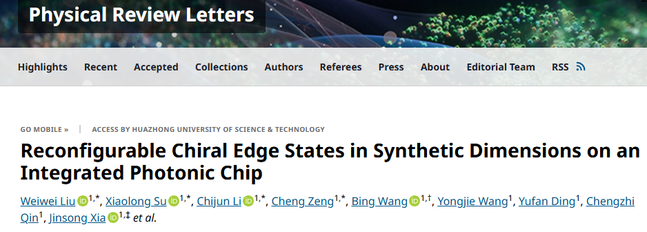 4月10日,《物理评论快报》(Physical Review Letters)在线发表了陆培祥教授带领的阿秒超快光学团队王兵教授、刘为为副教授与武汉光电国家研究中心夏金松教授团队合作在合成维度拓扑光子芯片方面取得的最新研究成果Reconfigurable chiral edge states in synthetic dimensions on an integrated photonic chip。