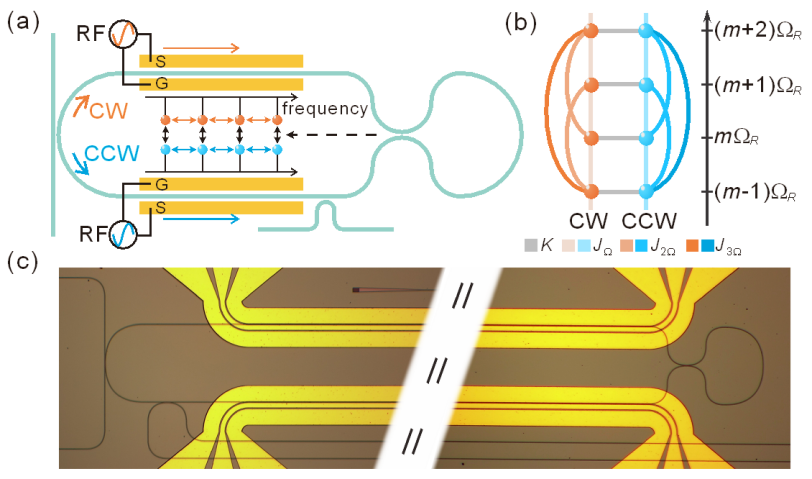 图1.(a)-(b)合成频率-赝自旋二维光子体系原理示意图; (c)光子芯片显微图像。