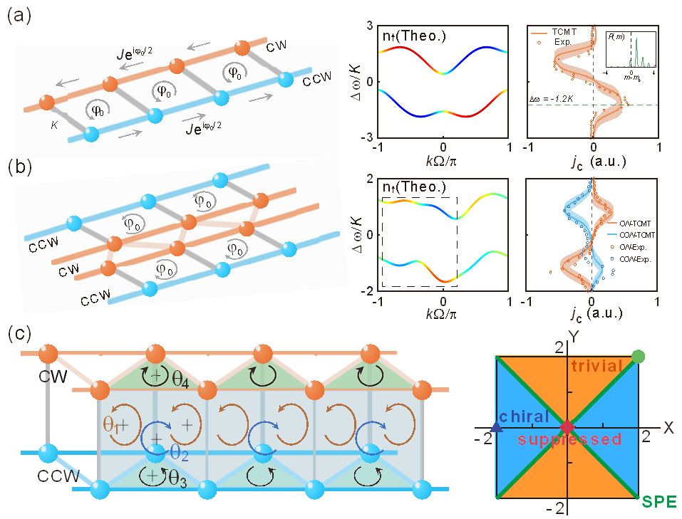 图2.(a)合成Hall梯子、能带和手性电流;(b)合成“异质界面”、能带和非平衡手性电流;(c)合成“赝三维”Hall梯子和拓扑相变相图。