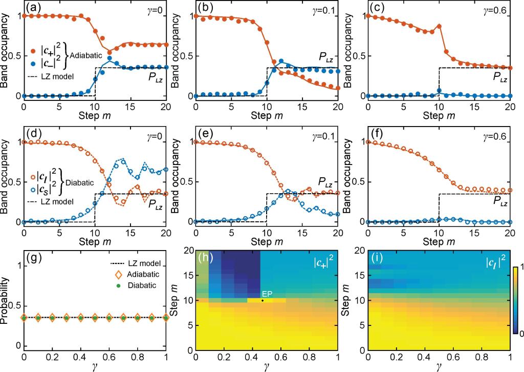 图2.实验中测得的非厄米朗道-齐纳隧穿过程。(a)-(c)绝热基下带占有数随步数的变化情况;(d)-(f)透热基下带占有数随步数的变化情况;(g)-(i)损耗因子对非厄米朗道-齐纳隧穿过程的影响。