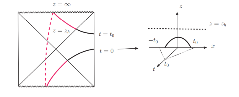 图:永恒黑洞的Penrose图,以及类时子区域与类空子区域对应的Ryu–Takayanagi(RT)曲面。(左图)黑洞视界将类时子区域对应的RT曲面分割为两部分。利用类时与类空纠缠熵的求和规则,我们发现黑洞内部的RT曲面(红色实线与虚线)可以表示为黑洞外部RT曲面(左图中黑色粗线)与若干类空区域对应的RT曲面(右图黑色粗线)的组合。这一结果表明,黑洞内部与外部的度规结构之间存在紧密联系。