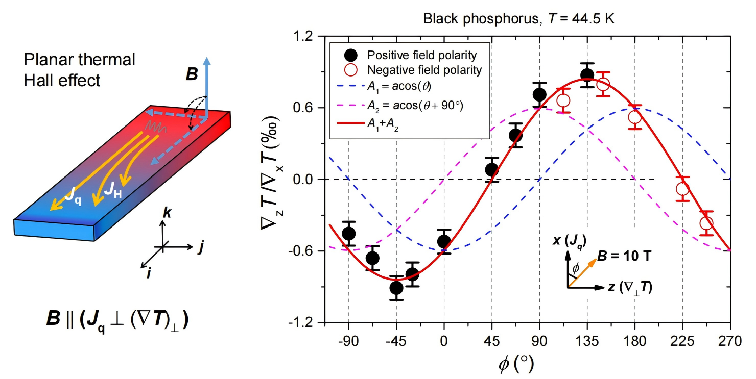 平面热霍尔效应的测量示意图(左)与黑磷中平面热霍尔效应转角依赖行为(右)